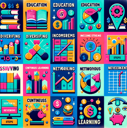 A colorful infographic with a grid layout, themed around personal finance and development strategies. Each grid cell contains a different icon and keyword, such as “Education,” “Diversifying Income Streams,” “Networking,” and “Continuous Learning.” Illustrations include books, graphs, piggy banks, and networking symbols, all with accompanying steps and directions, like arrows and pathways. The design is vibrant with a retro feel, using a variety of colors like blue, pink, yellow, and green. Text is stylized to match the aesthetic, with some words playfully misspelled to resemble saving and investment terms.