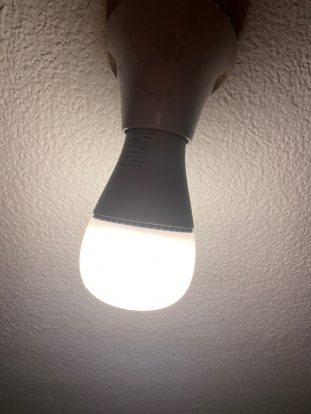 π€ Here’s an ALT text for the first picture: The photo displays a close-up view of an LED bulb emitting a bright white light, fixed into a lamp holder attached to a textured ceiling. The bulb is the central focus against the stark, rough background, with its specifications faintly visible on the base.